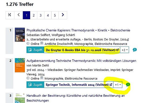 Im der Kurzanzeige eines Treffers gelangen Sie dann über den Link in der Kategorie Zugriff. Der Linktext variiert abhängig vom Verlag des eBooks. Beachten Sie bitte, dass es manchmal mehr als einen Link gibt, den Sie über den Pfeil am Ende der Zeile oder in der Vollanzeige des Tireffers aufrufen können.