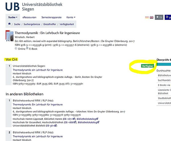 Auf der folgenden Seite können Sie nun sehen, ob das Buch evt. in gedruckter Form in der UB Siegen vorhanden ist oder in welchen anderen Bibliotheken das Buch vorhanden ist und es ggf. über Fernleihe bestellen.
